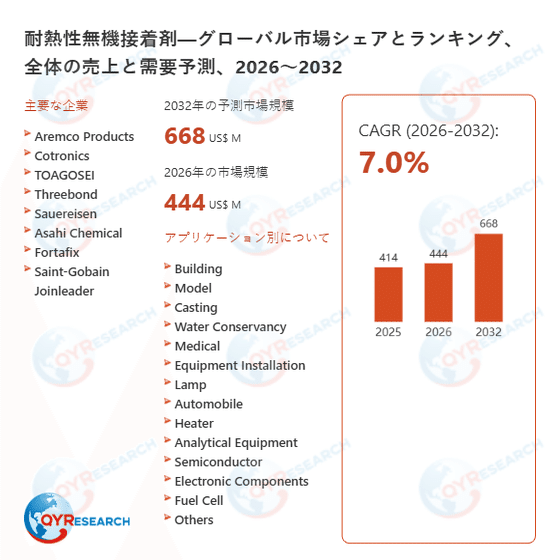 上記の図表/データは、QYResearchの最新レポート「耐熱性無機接着剤―グローバル市場シェアとランキング、全体の売上と需要予測、2026~2032」から引用されている。