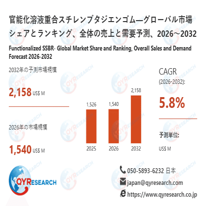 QYResearch調査チームの最新レポート「官能化溶液重合スチレンブタジエンゴム―グローバル市場シェアとランキング、全体の売上と需要予測、2026~2032」によると、官能化溶液重合スチレンブタジエンゴムの世界市場は、2025年に1526百万米ドルと推定され、2026年には1540百万米ドルに達すると予測されています。その後、2026年から2032年にかけて年平均成長率(CAGR)5.8%で推移し、2032年には2158百万米ドルに拡大すると見込まれています。