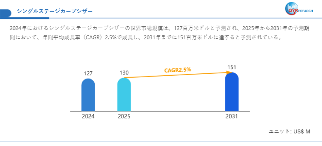 シングルステージカーブシザーの世界市場規模は2025年から2031年にかけて年平均成長率(CAGR)2.5%で拡大し、2031年には151百万米ドル規模に達する見込みです。市場は2024年に127百万米ドルと推定され、2025年には130百万米ドルに達すると予測されています。