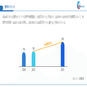 QYResearch調査チームの最新レポート「透明セラミック―グローバル市場シェアとランキング、全体の売上と需要予測、2026~2032」によると、透明セラミックの世界市場規模は2024年に156百万米ドルと推定され、2025年には165百万米ドルに達すると予測されています。さらに、2025年から2031年まで年平均成長率(CAGR)8.3%で成長すると予測されています。この成長により、2031年には市場規模が266百万米ドルに達すると見込まれています。
