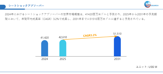 シートショックアブソーバーの世界市場規模は2025年から2031年にかけて年平均成長率(CAGR)3.2%で拡大し、2031年には51510百万米ドル規模に達する見込みです。市場は2024年に41420百万米ドルと推定され、2025年には42610百万米ドルに達すると予測されています。
