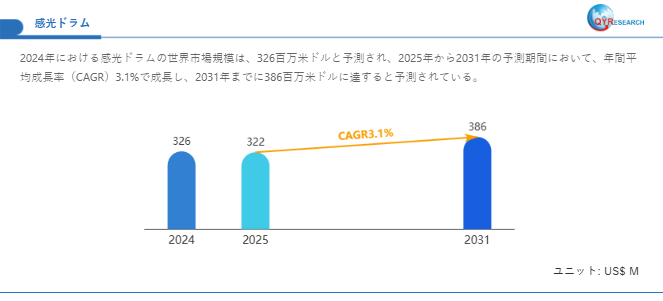 感光ドラムの世界市場規模は2025年から2031年にかけて年平均成長率(CAGR)3.1%で拡大し、2031年には386百万米ドル規模に達する見込みです。市場は2024年に326百万米ドルと推定され、2025年には322百万米ドルに達すると予測されています。