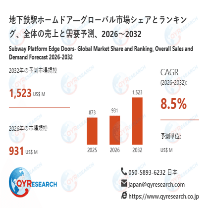 QYResearch調査チームの最新レポート「地下鉄駅ホームドア―グローバル市場シェアとランキング、全体の売上と需要予測、2026~2032」によると、地下鉄駅ホームドアの世界市場は、2025年に873百万米ドルと推定され、2026年には931百万米ドルに達すると予測されています。その後、2026年から2032年にかけて年平均成長率(CAGR)8.5%で推移し、2032年には1523百万米ドルに拡大すると見込まれています。